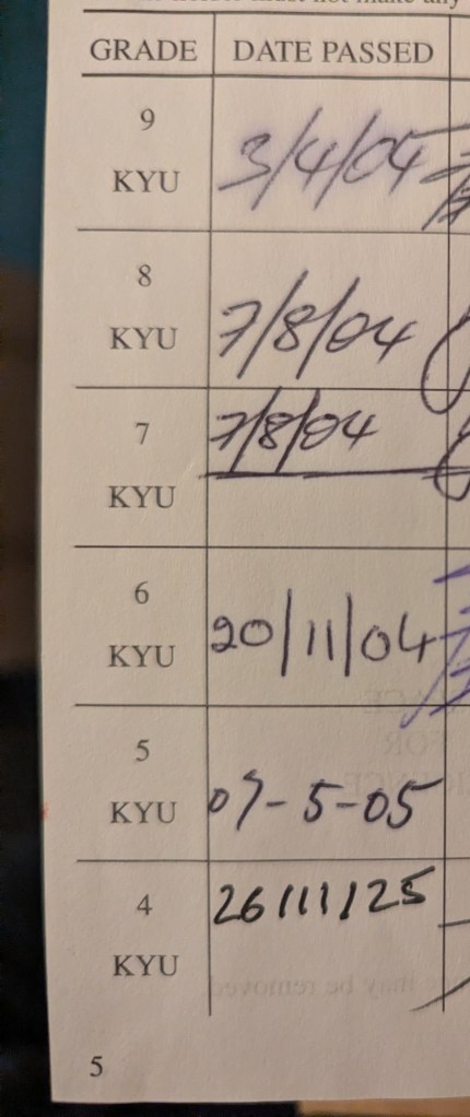 About 20 years ago, when I first started karate, I remember working on splits and not quite getting there, but seeing the progress over time was encouraging. Wouldn’t it be cool if 40-something-me ended up achieving that goal?